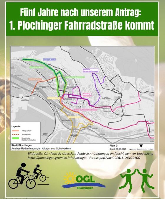 Die Entscheidung über die Vergabe der Radschnellwegbrücke konnte durch ein Entgegenkommen des Auftragnehmers vertagt werden. Eine definitive Entscheidung ist jetzt für Oktober avisiert. Bis dahin hat sich das Land hoffentlich auch auf eine Vorzugstrasse festgelegt, was die Akzeptanz des Brückenbauwerks bei CDU, ULP und BL steigern dürfte. Unsere prioritären Ziele beim RSW: Keine Trassenführung am nördlich Filsufer und kein Durchschneiden des Bruckenwasens.