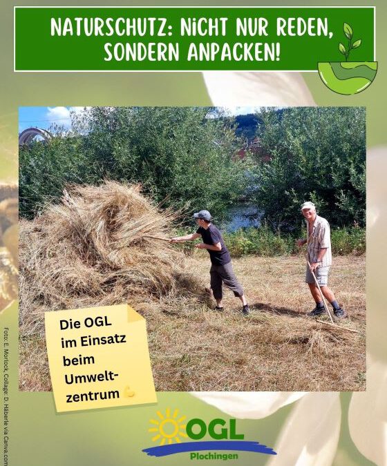 Das war das Motto, als wir uns am Morgen des 12. Juli mit einem kleinen, aber hochmotivierten Team am Umweltzentrum Neckar-Fils trafen, um bei der Vorlandpflege im Bruckenwasen zu unterstützen. Das Gras, das zuvor mit einem Balkenmäher gemäht worden war, musste zusammengerecht und aufgehäuft werden, so dass es anschließend abtransportiert werden konnte. Dadurch soll eine Überdüngung verhindert und so die spezifische Vegetation der ufernahen Wiese erhalten werden. Gleichzeitig sammelten wir leere Flaschen, Hundekot-Beutel und anderen auf der Wiese herumliegenden Unrat auf.
